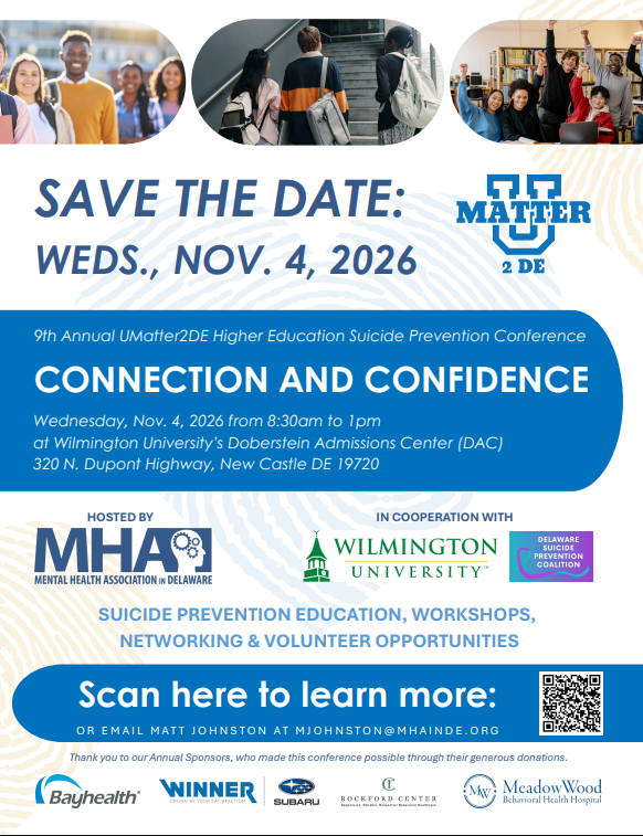 MHA’s 9th Annual UMatter2DE Higher Education Suicide Prevention Conference will be held on November 4, 2026 at Wilmington University in New Castle, DE. The theme is “Connection and Confidence” and will include suicide prevention education, workshops, networking opportunities and more!